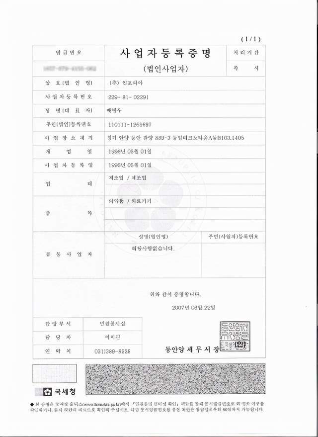 3.韩方的事业者登录证明(사업자등록증명)或固有号码证复印件、印鉴证明书(인감증명서,邀请函里同样印鉴章);